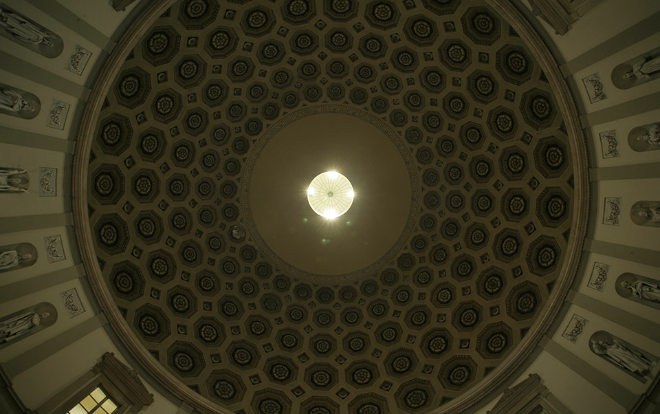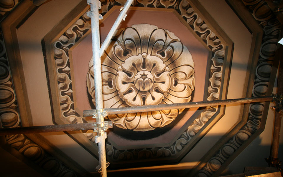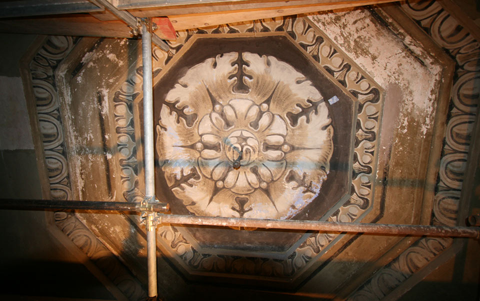 Dopo le operazioni di pulitura graduata e differenziata dei lacunari e degli elementi decorativi della Cupola, i toni antichi sono immediatamente riemersi nei loro cromatismi originali e luminosi, appesantiti ulteriormente nel corso del restauro degli anni '50.