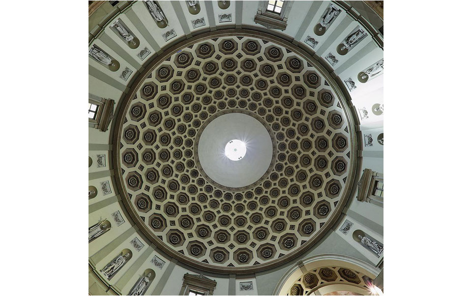 Concepita dal Pizzagalli (senza l'aiuto di armature), è stata decorata con lacunari classici ottagonali a rosone centrale. La Cupola, conclusa dal lucernario (e non aperta da un foro centrale come il Pantheon di Roma dove si voleva simboleggiare la compenetrazione cielo-terra) è simbolo della tenda cosmica, della volta celeste, della dimora dell'Altissimo e di Cristo, Zenit del mondo. Il Tempio diviene un luogo che si apre all'Infinito, linea di contatto con l'Assoluto.