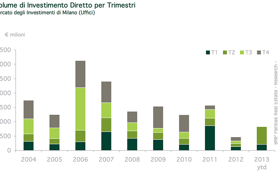 Per quanto riguarda la piazza di Milano, non sono state registrate nessuna transazione nel corso del terzo trimestre, tranne una piccola agenzia bancaria, facendo così segnare una battuta d’arresto nella ripresa iniziata nei primi sei mesi dell’anno. Tuttavia, il totale annuo di € 829 milioni è ben superiore ai € 469 milioni registrati nel 2012. Di questo totale, il 68% degli investimenti aveva riguardato uffici nel 2012, quota scesa al 41% quest’anno vista la transazione del Qatar che pesa per 48% del totale.