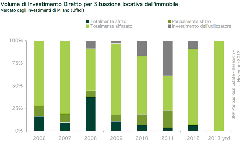 Gli uffici compravenduti a Milano sono per la totalità a reddito, ossia affittati mentre in passato questo non era il caso. Quest’andamento è andato via via crescendo con l’accentuarsi della crisi che ha provocato l’aumento dello sfitto a Milano. Pertanto, rimane molto difficile oggi riuscire a vendere un’immobile che presenti una parte importante di sfitto: trovare un conduttore in questa fase di mercato è il vero tema.