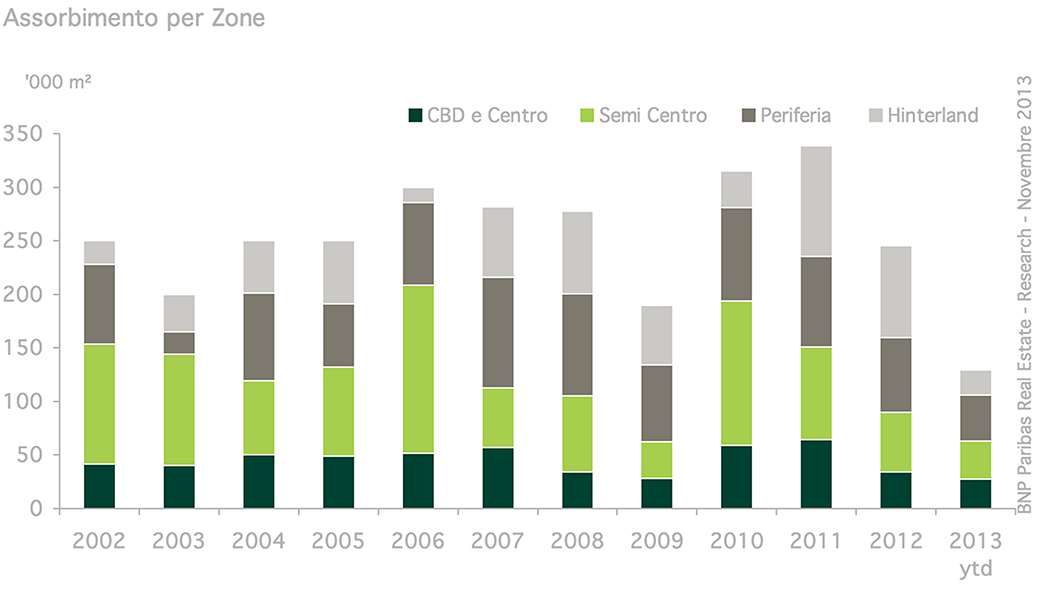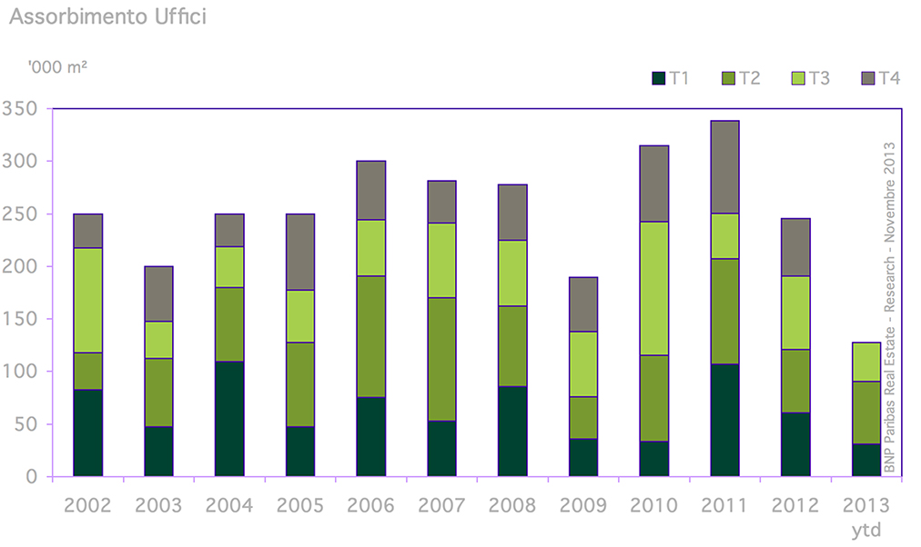 Il volume di assorbimento lordo registrato nel trimestre non ha superato i 40.000 m², rappresentando uno dei livelli più bassi degl’ultimi trimestri. E’ vero che il terzo trimestre è sempre stato quello che ha fatto registrare una minore attività nell’anno, ma questa è una tendenza che prosegue dall’anno scorso.