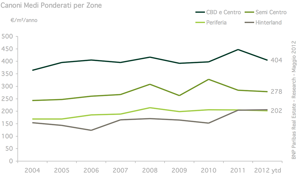 La tendenza al ribasso dei canoni medi iniziata alla fine del 2011 è ancora in corso. Inoltre, i canoni prime, che sono un indicatore di “nicchia” si sono ridotti e si situano nel CBD sotto ai 500 €/m²/anno.