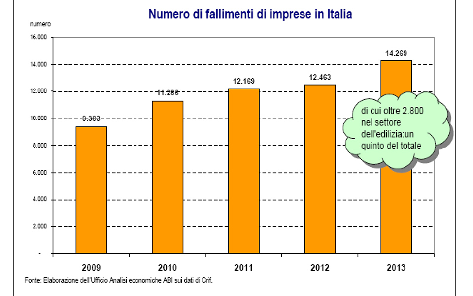 Nel 2013, il settore edile ha registrato oltre 2.800 casi di fallimenti, un quinto del totale nazionale. La Lombardia è stata la regione con il maggior numero, situazione che si è protratta anche nei primi mesi del 2014.