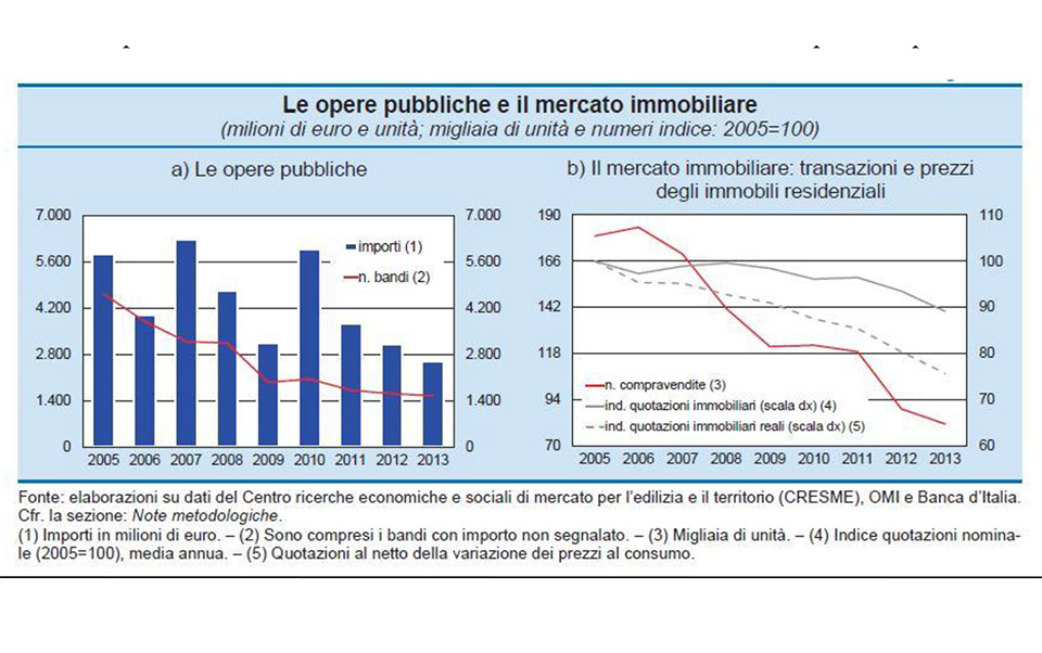 Il numero di bandi per opere pubbliche e i prezzi degli immobili residenziali sono crollati. I maggiori sbocchi per il settore (opere pubbliche e mercato residenziale) presentano elementi fortemente negativi.