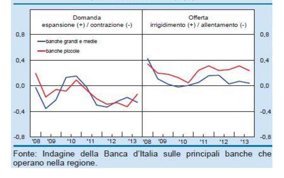 Dal lato dell’offerta, si è pressoché arrestato il processo di irrigidimento delle condizioni di accesso al credito, seppure con residue tensioni nei confronti delle imprese delle costruzioni. Con riferimento alle quantità erogate vi sono segnali di un’offerta più distesa e anche le condizioni di costo praticate sulla media dei finanziamenti sono lievemente migliorate.
