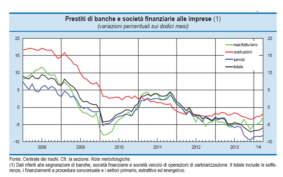 Secondo i dati che emergono dalla ricerca sull’economia regionale della Lombardia realizzata da Banca d’Italia e presentata a novembre 2014, tenendo conto non solo dei prestiti bancari, ma anche di quelli delle società finanziarie, nei dodici mesi terminanti a giugno il credito erogato alle imprese lombarde è diminuito del 4,8 per cento, una contrazione meno accentuata di quella registrata nel corso del 2013 (-6,8 per cento).