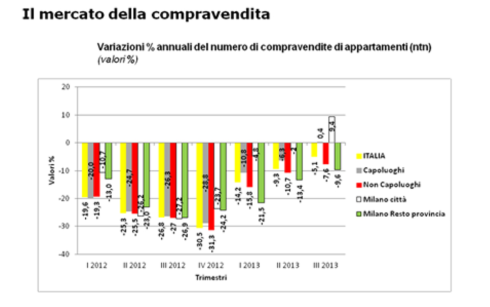 FIMAA Milano Monza & Brianza opera, dunque, in una realtà che, nonostante la crisi, ha mantenuto una certa vivacità. Gli ultimi dati dell’Agenzia delle Entrate (riferiti al terzo trimestre del 2013) mostrano, per il mercato residenziale, un indicatore finalmente positivo (+9,4) per il numero delle transazioni (grafico 1), dopo molti trimestri con andamento negativo sotto tutti i punti di vista. Certo, ciò non significa che sia già iniziata una vera ripresa: la crisi ha infatti inciso in maniera drastica sui volumi di compravendita delle abitazioni, dimezzando in 6 anni le transazioni (grafico 2). Tuttavia, siamo entrati in una fase di stabilizzazione che prelude ad una crescita vera e propria delle stesse. Crediamo, infatti, che da questo segnale sia possibile scorgere un cambiamento importante per il nostro mercato. A Milano, il 2014 si preannuncia come un anno di consolidamento delle tendenze di normalizzazione, già espresse negli ultimi mesi del 2013, e più precisamente: il 1° semestre dell’anno presumibilmente confermerà, per il numero delle compravendite, tale trend, mentre i prezzi subiranno ancora qualche “limatura”, per far registrare una stabilizzazione solo nel 2° semestre. Per quanto riguarda, infine, i “top price”, ossia quei valori che rappresentano i valori più elevati, anche il 2° semestre del 2014 sarà connotato da un’ulteriore contrazione dei prezzi. Da segnalare inoltre che nel 2° semestre dell’anno la città di Milano mostrerà un maggior fermento, sotto molteplici punti di vista, e soprattutto si assisterà alla diffusione di un clima di fiducia e di “voglia di fare” generalizzata, grazie all’approssimarsi dell’evento EXPO 2015. Un elemento infine di indubbia rilevanza, in termini di inversione di tendenza del nostro mercato verso un possibile rilancio, è rappresentato dalla comparsa degli investitori opportunistici: l’Italia sta tornando infatti ad essere nuovamente appetibile e, considerata l’ottica di investimento di medio/breve termine che caratterizza questa tipologia di operatori, tale ripresa si preannuncia relativamente vicina.