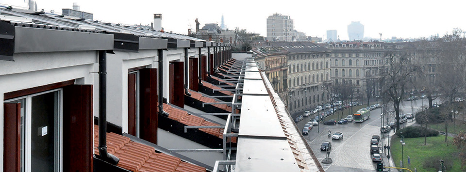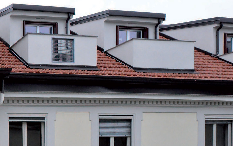 _la sostituzione delle strutture lignee delle attuali porzioni a falde della copertura con nuove travi in acciaio ed assito collaborante, con formazione di terrazzini a tasca, abbaini e lucernari, previa modifica e rinforzo delle murature portanti sottostanti, che hanno costituito una parte cospicua del processo di progettazione e calcolo strutturale;