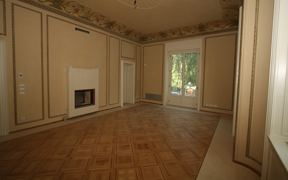 Le prime opere interne eseguite hanno riguardato la catalogazione, lo smontaggio dei serramenti e degli imbotti esistenti, la numerazione ed il recupero pezzo per pezzo di circa 400 mq di parquet.