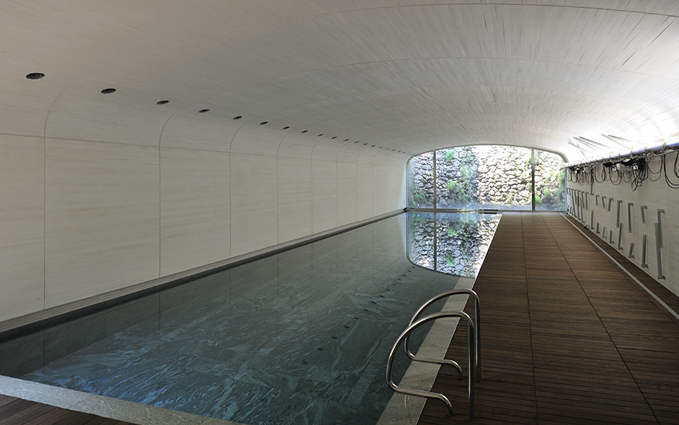 Una delle lavorazioni più interessanti dell’intervento è stato lo studio e la realizzazione delle pareti e della volta della piscina: sono state definite le sezioni, sono stati campionati in accordo con le Direzioni Lavori i materiali e la finitura della superficie.