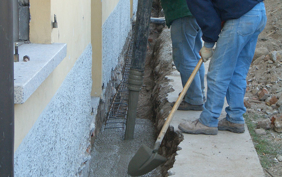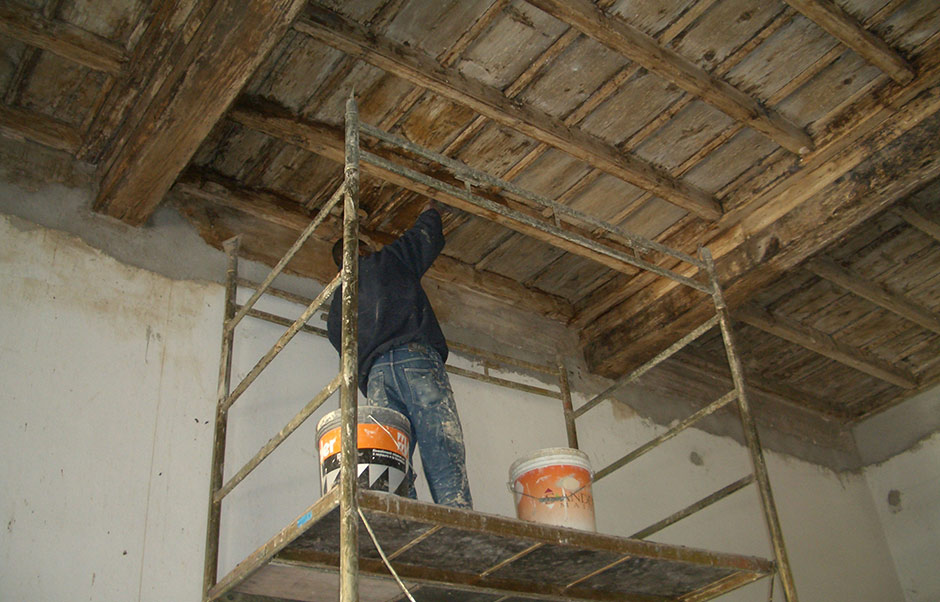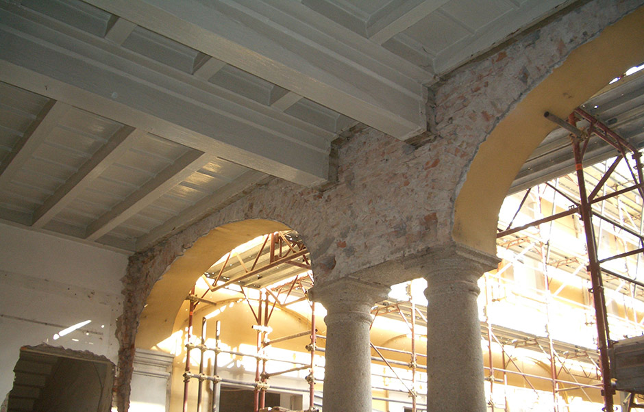 L’intervento ha riguardato innanzitutto le strutture, operando una controventatura delle fondazioni dirette attraverso la realizzazione di una soletta in calcestruzzo armato, vincolata ad un cordolo realizzato scavando lungo il perimetro esterno dell’edificio, tramite barre d’acciaio passanti per le murature portanti. Le modifiche delle strutture verticali sono state ridotte laddove le esigenze di adeguamento lo abbiano richiesto. Il primo piano dell’ala ovest ha visto il ripristino delle strutture sfondate durante l’intervento degli anni Settanta per la realizzazione di un corridoio di distribuzione. Il portico con colonne binate collocato nella zona centrale dell’edificio, precedentemente chiuso da un serramento è stato liberato. La riapertura ha anche richiesto il restauro della pavimentazione esistente e il rifacimento degli intonaci delle porzioni murarie.