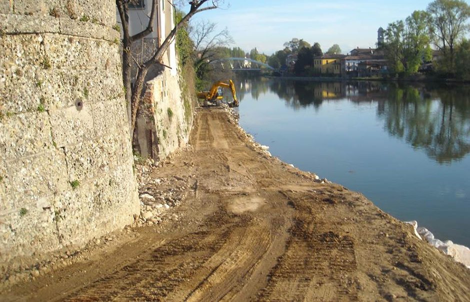La formazione di una pista di cantiere alla base del muro che sorregge la Strada Alzaia Sud, costituita da una scogliera con pietrame di cava delle Prealpi Bresciane, di pezzatura idonea fino a 25 ql e selciatone realizzato con massi sbozzati di pietra, si è resa fondamentale sin dalla fase di cantierizzazione in quanto è stata utilizzata per tutte le lavorazioni, quali il restauro del paramento del muro storico, il varo dei portali in carpenteria metallica ed il risanamento delle strutture in cls esistenti. Questa pista è poi rimasta per essere utilizzata per le opere di futura manutenzione.