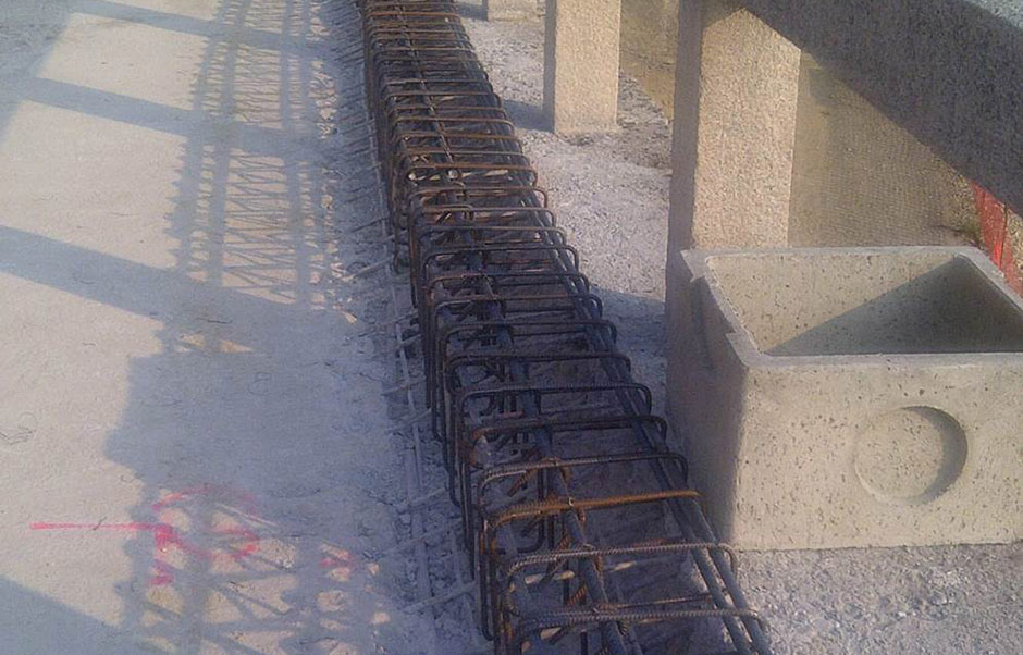 Una volta posate le armature si è provveduto al getto della soletta con l’ausilio di pompa, di fatto abbandonando le soluzioni progettuali che prevedevano lastre di tipo predalles. Al termine delle lavorazioni di carpenteria e del getto dei solai, prima della stesa delle sovrastrutture stradali, si è provveduto alla impermeabilizzazione dell’impalcato attraverso la stesa di cappa asfaltica.