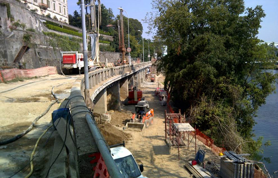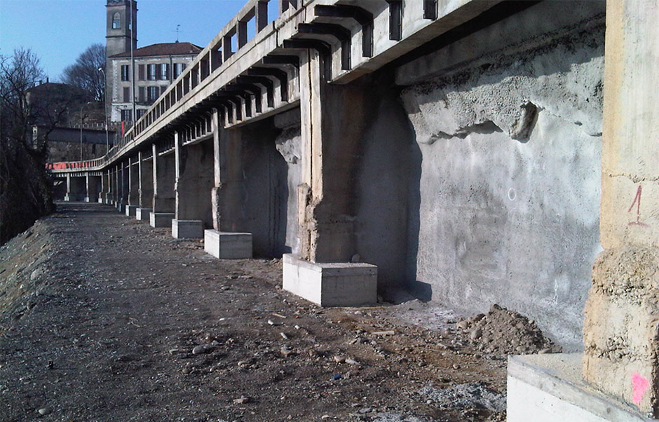 costituito da materiale sciolto che avrebbe potuto improvvisamente collassare provocando anche l’esondazione della Martesana verso il fiume Adda. Vista l’importante tematica relativa alla messa in sicurezza della strada e della Martesana, dopo aver esaminato alcune proposte si è optato per la realizzazione di una paratia in micropali “berlinese” che oltre a servire per il sostegno del muro spondale è stata utilizzata, previa esecuzione di una trave di coronamento in testa, come ancoraggio/appoggio della nuova soletta di calcestruzzo armato. Prima della realizzazione del rivestimento in spritz beton si è provveduto alla pulizia della berlinese dalla terra ed alla posa di un doppio strato di rete elettrosaldata in acciaio risvoltata lateralmente sui setti.