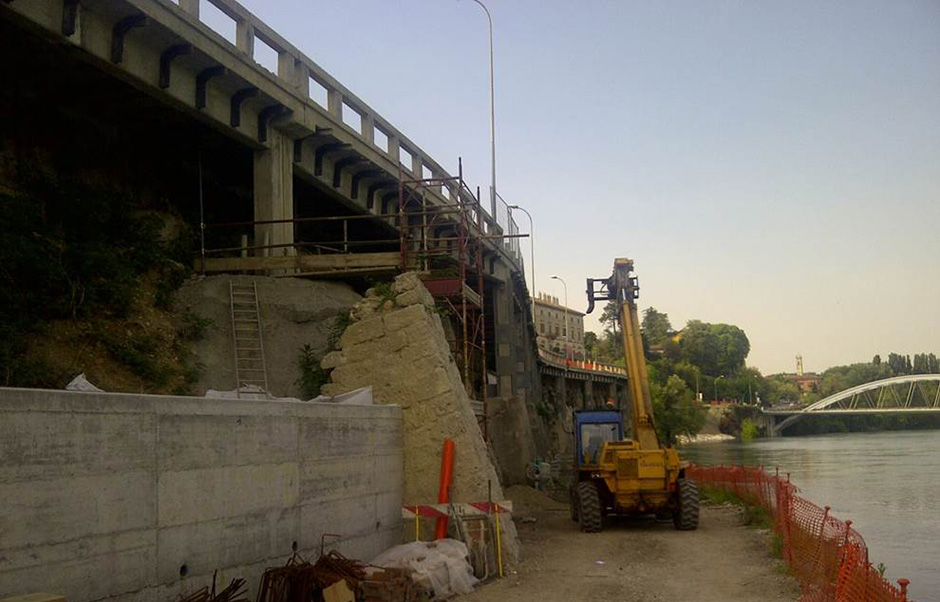 In seguito alla pulizia del muro e della scarpata antistante, si è potuto osservare che i pilastri 31, 33, 34 e 35 presentavano delle fondazioni non particolarmente stabili ed inoltre appoggiavano in parte sul muro esistente, a sua volta in un precario stato di conservazione. Stante la situazione sopraesposta si è prevista la realizzazione di micropali ancorati al pilastro con un collare in c.a. collegato ai piedritti esistenti a mezzo di barre in acciaio passanti entro fori eseguiti mediante la perforazione dei setti, tutto ciò previo scavo a mano in condizioni veramente disagiate. Nella configurazione originaria della strada il terreno riempiva quasi completamente lo spazio al di sotto della soletta, non rendendo di fatto praticabile la realizzazione del collare dei micropali. La fondazione del pilastro 32 risultava più stabile rispetto a quella dei pilastri adiacenti, tuttavia si è ritenuto opportuno il posizionamento di tiranti per ancorarla al terreno retrostante e contrastare eventuali fenomeni di spinta orizzontale generati a causa della presenza di materiale sciolto. Oltre agli interventi sui pilastri 31, 32 e 33 è stato realizzato un muro in c.a. adiacente alla pista di cantiere per il sostegno della scarpata compresa tra il pilastro 31 e 33. Tale tratto di scarpata risultava infatti in pessime condizioni; inoltre si è proceduto al consolidamento del muro esistente mediante riempimento degli interstizi con malta e con la formazione di muratura in mattoni pieni per la chiusura dei vuoti di notevoli dimensioni. Tra i pilastri 30 e 31 si è riscontrata la presenza di una forte instabilità del rivestimento del muro in puddinghe. Tale instabilità ha reso necessario anche un locale allargamento della pista per evitare che i mezzi di cantiere transitassero nelle vicinanze. Si è provveduto quindi alla realizzazione di un cordolo in c.a. alla base del muro nel tratto compreso tra il contrafforte e il pilastro 30, tale cordolo è stato ancorato al terreno mediante una fila di micropali su cui è stata eretta una struttura in carpenteria metallica tirantata c o n la funzione di reggere la spinta delle terre ed evitare il rischio di distacco delle puddinghe. Si è passati poi al consolidamento del muro stor ico degradato mediante riempimento con malta degli interstizi tra le puddinghe e la posa di mattoni nei vuoti di maggiore dimensione. Oltre a questi interventi, come da progetto, è stata prevista la rimozione della vegetazione presente, che, come già precedentemente illustrato, è in buona parte la responsabile del degrado del muro storico.