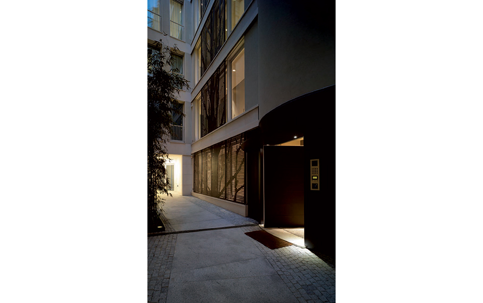 Il passaggio, prescritto dal Piano Particolareggiato, costituisce anche l’accesso principale all’edificio il cui ingresso residenziale è costituito da un atrio circolare, che funge da nocciolo distributivo a tutti i piani come sbarco sia del corpo scala che dell’ascensore, ed è posto in relazione al cortile interno centrale al lotto. Questo piccolo cortile nascosto, è uno spazio segreto a cielo aperto in cui finestre e pannelli di metallo corten, contribuiscono a ricostruire quasi i palchi di un teatrino urbano e domestico.