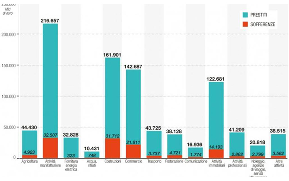 Negli studi abbiamo visto in un’immagine come esistano 32 mld di sofferenza su 162 mld di impegni per le imprese di costruzioni ed in un’altra immagine il rapporto tra le sofferenze e gli impieghi del settore produttivo.