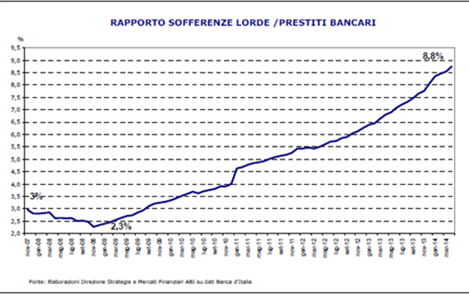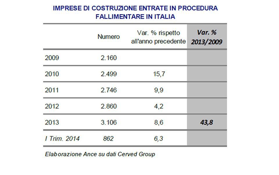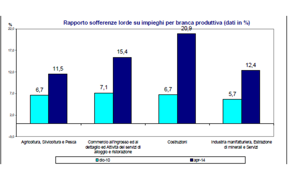 Lo stato di sofferenza delle imprese è notevolmente aumentato negli ultimi anni, se confrontato con altri paesi: i fallimenti sono aumentati in Italia più che altrove, dal 2009 al 2013 + 43,9%.