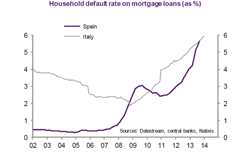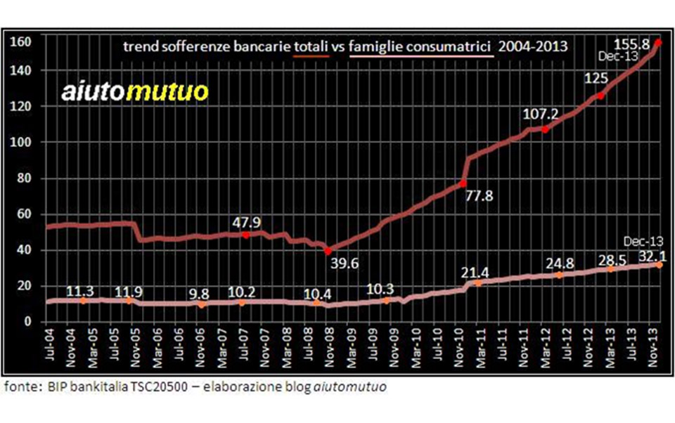 Il Tasso dei mutui non pagati all’inizio del 2014 era del 6% mentre prima della Grande Crisi differiva veramente di poco. Nel grafico successivo possiamo altresì notare come le sofferenze delle famiglie rappresentino, in ogni periodo considerato, circa un quinto delle sofferenze totali.