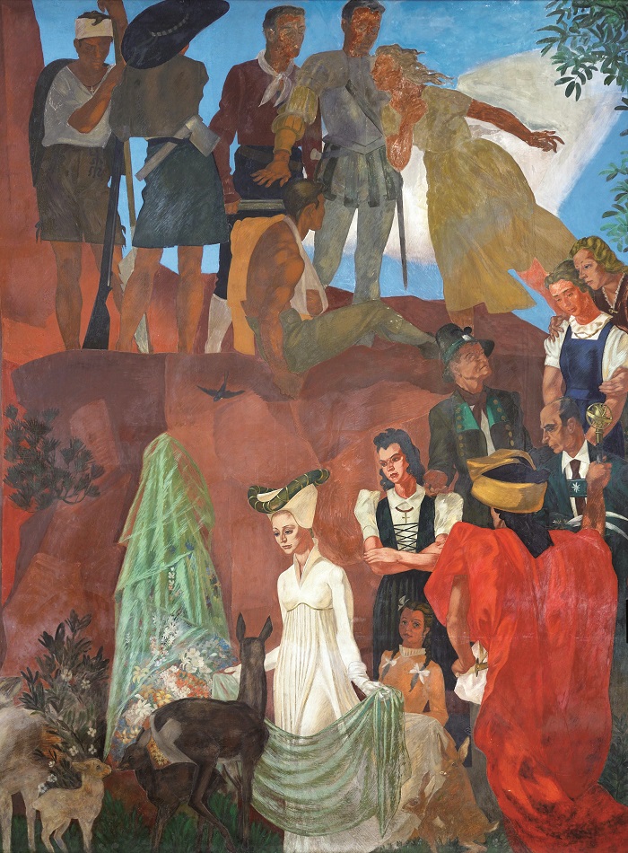 Secondo il costume dell'artista gli attori della scena dipinta hanno i volti di personaggi reali quali: Adriana Dudovich, Ambrogio Gadola e Paolo Lodigiani, rispettivamente primo e secondo presidente del Collegio Lombardo Imprese edili ed affini. Oltre a immagini del dipinto e a documenti che lo riguardano, come il numero del 31 luglio 1954 del «Giornale dei Costruttori» e foto d'epoca, la mostra offre una selezione di splendidi disegni che descrivono la metodica seguita dall'artista nell'ideazione delle varie figure e ne rivelano l'innata abilità, anche di ritrattista.
