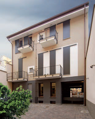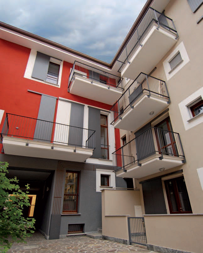 Il volume soprastante gioca con gli elementi compositivi tipici del tessuto storico milanese combinandoli in un insieme equilibrato nella sua asimmetria: l’intonaco di facciata è di un caldo colore tortora, il gioco delle aperture, ora raggruppate a nuclei, ora isolate, permette di ridurre il peso della massa architettonica. Le finestre sono di volta in volta lavorate in termini diversi quasi a voler conferire un’inaspettata, giocosa casualità alla facciata: alcune sono raggruppate e inquadrate in cornici di intonaco bianco ghiaccio, altre più piccole sono sottolineate da una cornice piana che le dilata sulla superficie della facciata, altre ancora si inseriscono nella facciata come tagli netti. Le persiane scorrevoli contribuiscono a variare l’equilibrio distributivo del cromatismo di facciata in relazione alla loro posizione: quando risultano chiuse svincolano la vista dei riquadri bianchi che raggruppano le finestre, quando sono aperte entrano nel gioco degli equilibri cromatici della facciata. Il secondo cortile, più interno e intimo, è giocato su principi analoghi al primo; tuttavia, la diversa altezza interna dei due nuclei in cui è articolato l’edificio suggerisce la soluzione di diversificare il colore dell’intonaco di facciata. Un divertissement rosso cadmio per la facciata più interna e meno esposta che realizza una piacevole digressione del tema dominante color tortora.