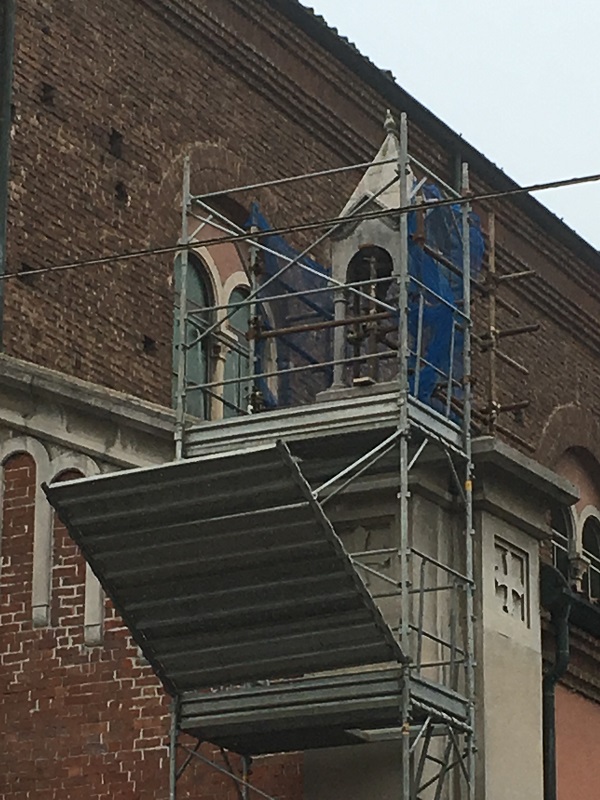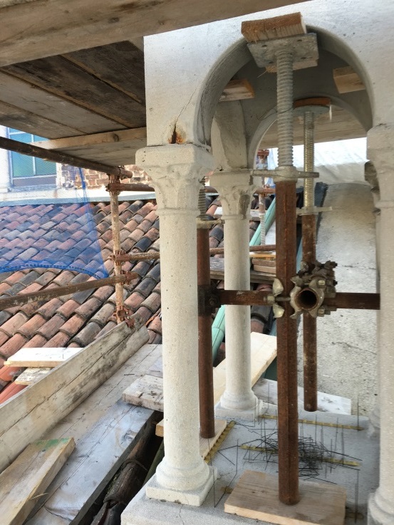 Sono state montate mantovane parasassi e sono state allestite “gabbie” di contenimento in tubo e giunto, chiuse con reti elettrosaldate in ferro zincato per impedire la caduta di detriti sul sagrato, e sono stati approntati puntelli provvisori di sostegno in tubo/giunto per ridurre il carico verticale sulle colonnine portanti delle edicole stesse.