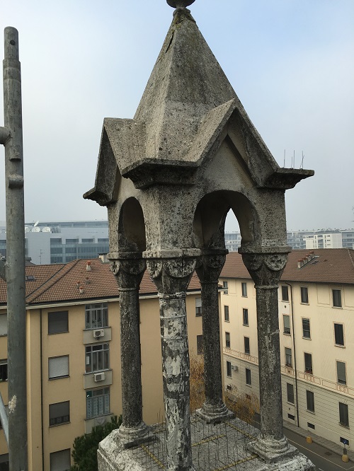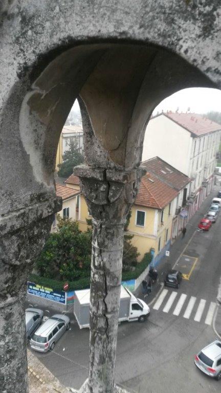 L’urgente situazione di pericolo è stata risolta con un primo intervento di messa in sicurezza delle edicole, della croce e della cornice di sottogronda, realizzato nel mese di dicembre del 2015.