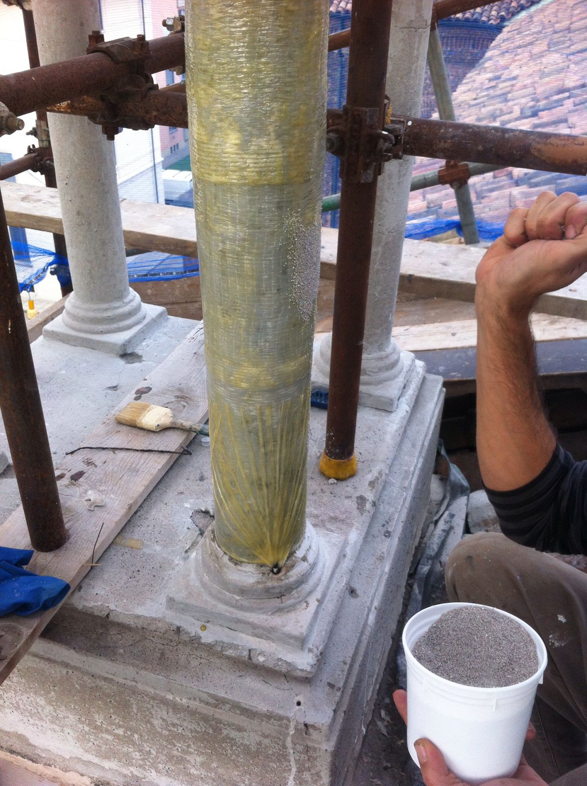 • impregnazione tessuto fibra vetro con resina epossidica fluida e applicazione a resina ancora fresca di sabbia al quarzo asciutta in modo da ottenere un’adeguata superficie di adesione per il successivo strato di finitura che è stato steso su tutto il corpo della croce.