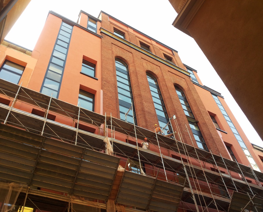 A partire dagli anni Dieci del terzo Millennio, fenomeni di distacco d’ingenti parti lapidee prospicienti le pubbliche vie, e pericolosi “spanciamenti” dei rivestimenti in laterizio, suggerivano la proprietà, di effettuare un sopralluogo delle facciate, con piattaforme atte a raggiungere le consistenti altezze dell’edificio, per eseguire una “battitura referenziata” dello stato dei rivestimenti (sia lapidei che di laterizio).
