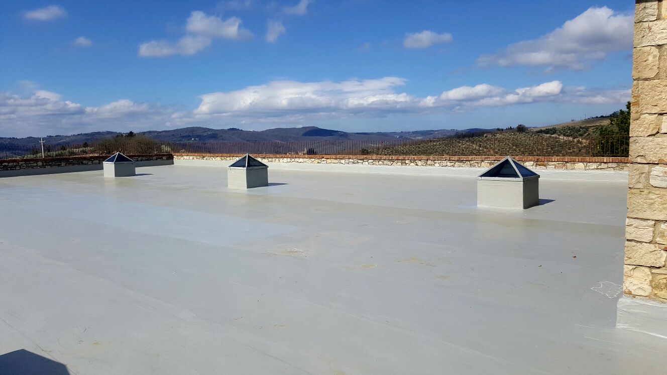 La geometria della superficie non è particolarmente complessa , ma la precedente impermeabilizzazione in membrana bituminosa, oltre a non aver garantito la tenuta all’acqua, è stata anche ricoperta con un massetto che ne impedisce una facile manutenzione. Ci siamo quindi orientati verso una soluzione liquida “a vista”, capace di offrire una impermeabilizzazione continua, monolitica e di facile manutenzione.