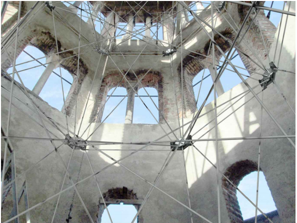 È risultato necessario un intervento di consolidamento per migliorare il comportamento strutturale globale del fusto in muratura, attraverso una struttura interna in cavi di acciaio, che non solo permette di eseguire i lavori di consolidamento in tempi rapidi, ma anche di facilitarne la posa all’interno di spazi difficili da raggiungere, data l’altezza della Torre Nolare che supera i 52 metri.