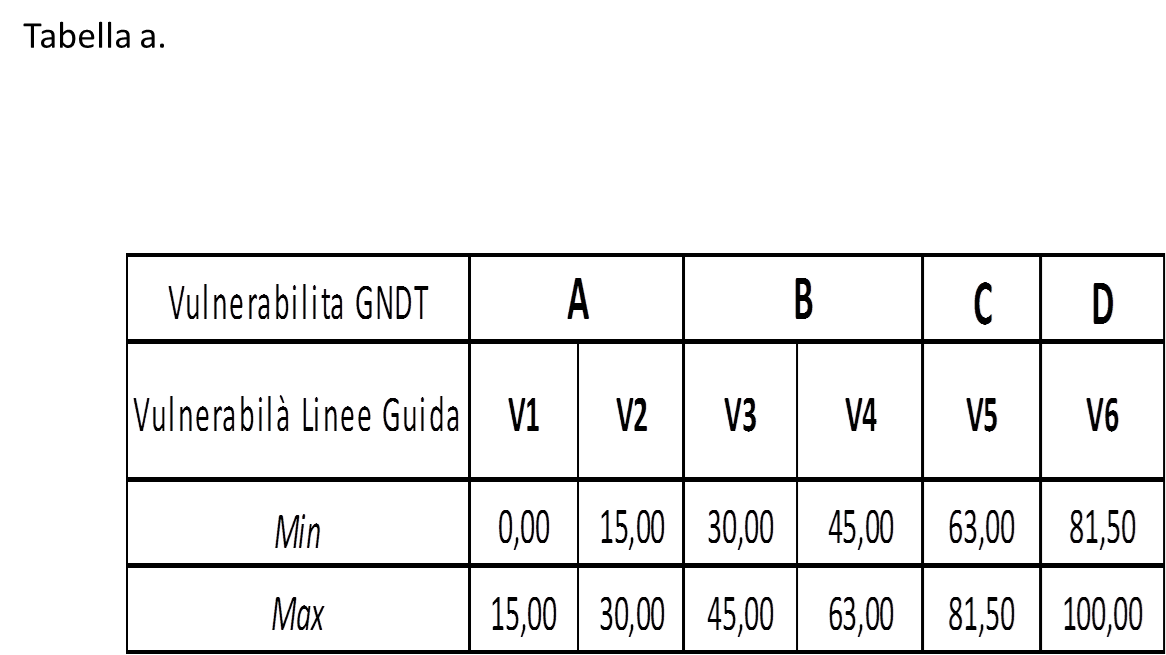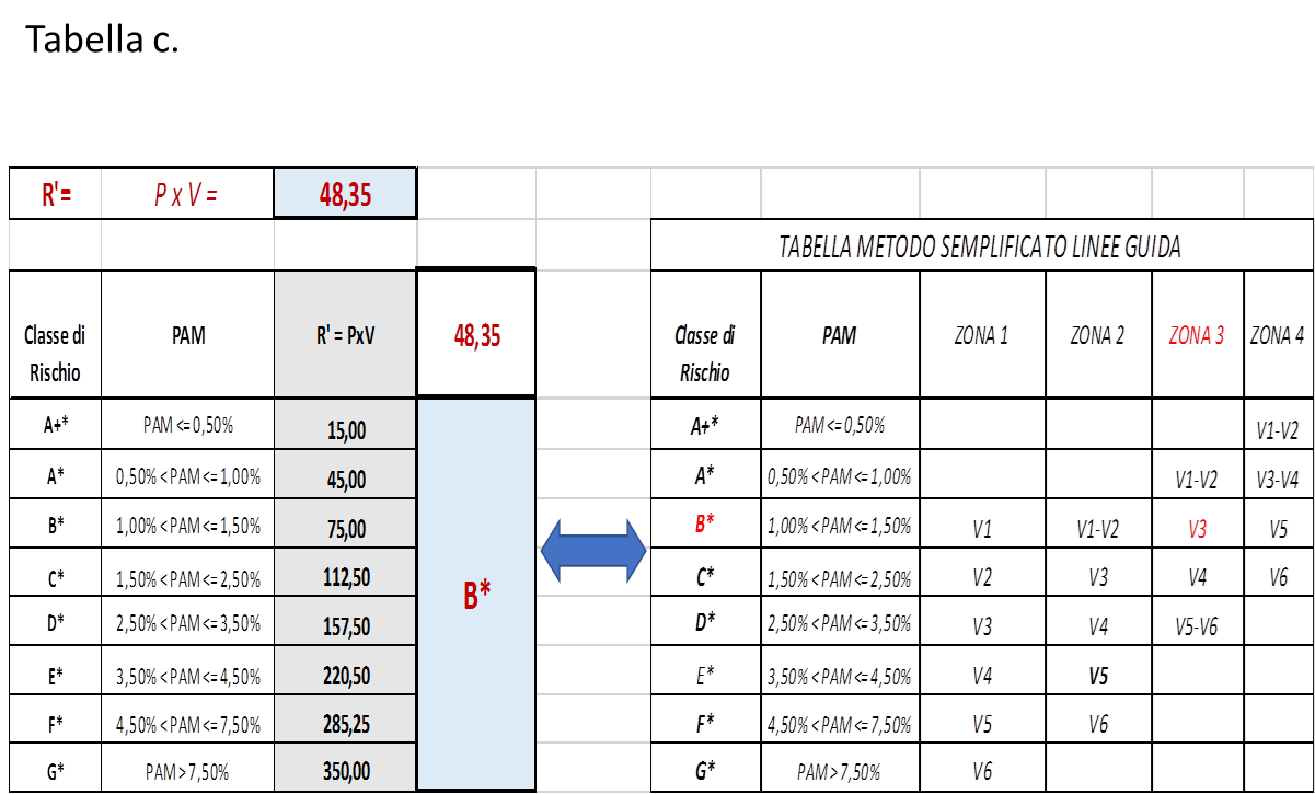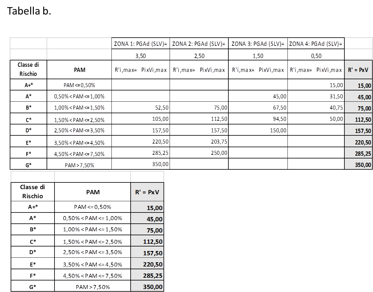 Con i valori di vulnerabilità (V1/V6), moltiplicati per i valori di pericolosità (ag1/ag4) afferenti alla 4 zone sismiche, si ottengono i valori R’ collocati nella tabella B secondo quanto previsto dalla tabella 5 delle Linee Guida.