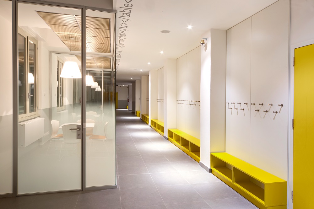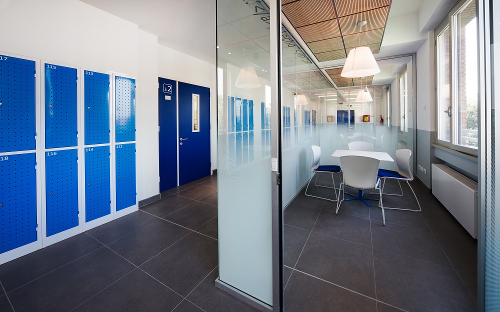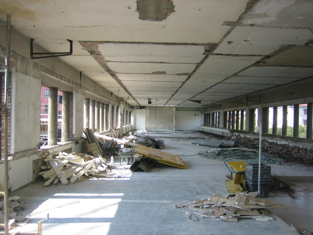 La sfida principale della realizzazione sono stati i tempi ristretti (solo 90 giorni) in relazione al tipo di intervento e alle superfici interessate (6 piani fuori terra, tutte le aree e campi sportivi esterni, il blocco mensa e le palestre, i nuovi ascensori, per oltre 4.500 mq di intervento); dopo lo strip out integrale degli edifici esistenti sono stati realizzati tutti i nuovi divisori con tecnologie a secco e pacchetti in grado di rispettare i requisiti di solidità, acustici e antincendio, i nuovi pavimenti con ceramiche di grande formato, i blocchi bagno ricorrendo a pareti modulari componibili, i campi sportivi esterni, le palestre, la mensa, le cucine ed aree servizi, i luoghi di culto; in parallelo si è proceduto con lo sviluppo e la realizzazione di tutta l’impiantistica e la sostituzione dei serramenti esterni; chiavi vincenti per la riuscita del progetto sono stati un alto livello di programmazione delle forniture, l’individuazione di soluzioni costruttive e di distribuzione impiantistica modulari e ripetitive livello per livello, l’elevatissimo grado di collaborazione tra tutti gli attori coinvolti nella realizzazione dell’opera.